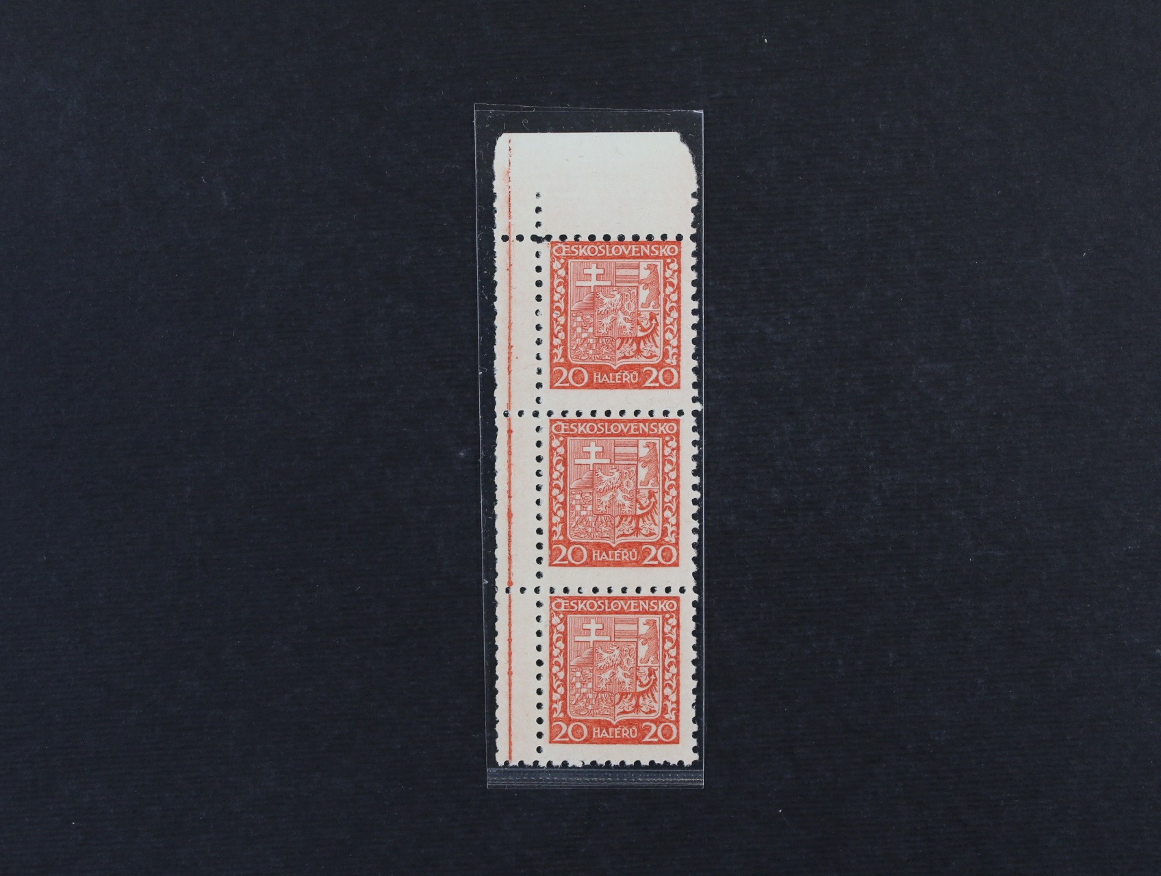 • zn. č. 250 - levá svislá roh. dvoupáska s dvojitou perforací na okraji, kat. cena 1500 Kč