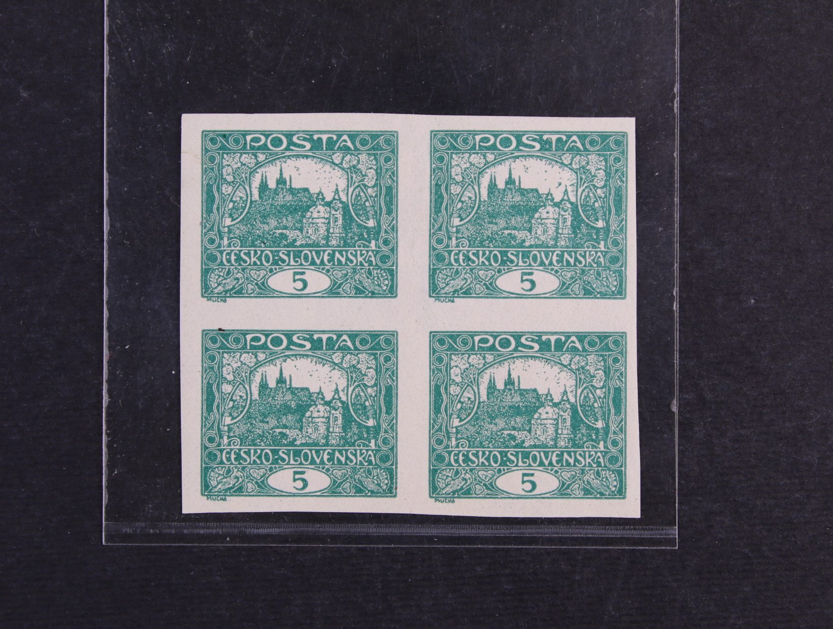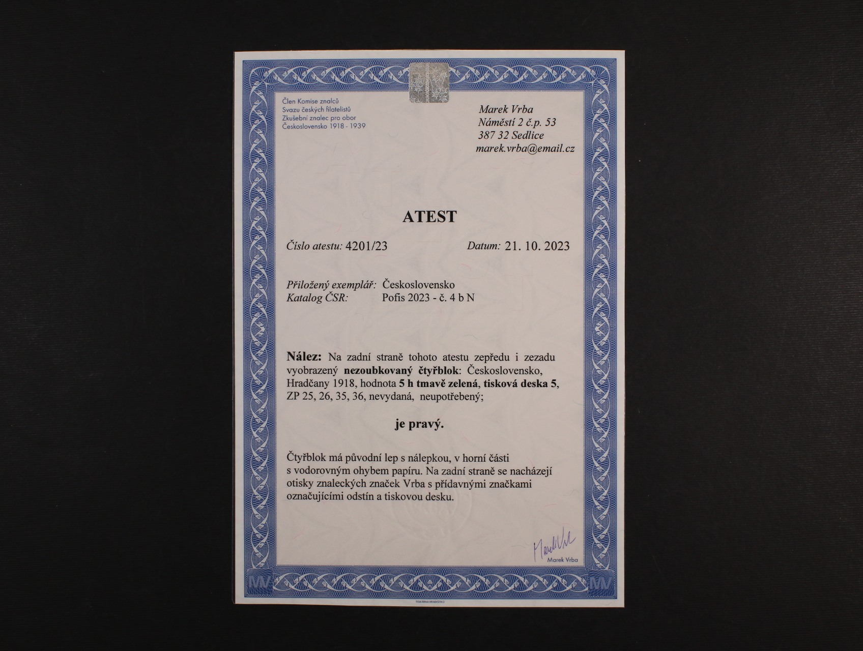 • zn. č. 4 Nb, typ I, tmavězelená ve čtyřbloku, TD 5, přes horní dvě zn. vodorovný lom v papíru, zk. a atest Vrba