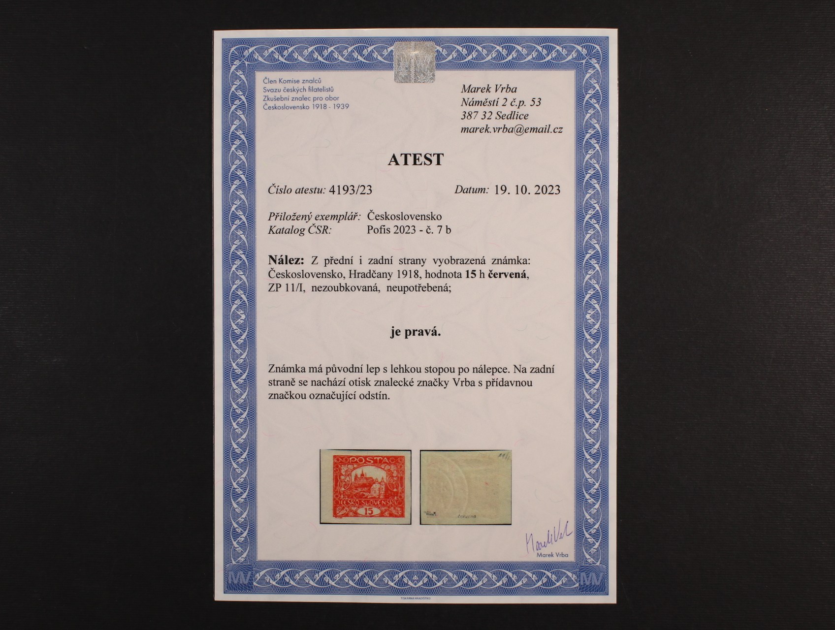 • zn. č. 7b 15h červená, krásný sytý odstín, velmi vzácná barva, zk. a atest Vrba, lehká stopa po nál.