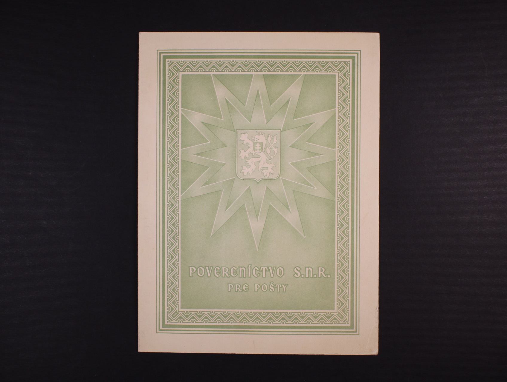 zn. č. A408-12 v původních destičkách "Poverenictvo S.N.P. pre pošty" s podpisem povereníka Ševčíka, ohlý pravý dolní rožek jinak pěkný stav