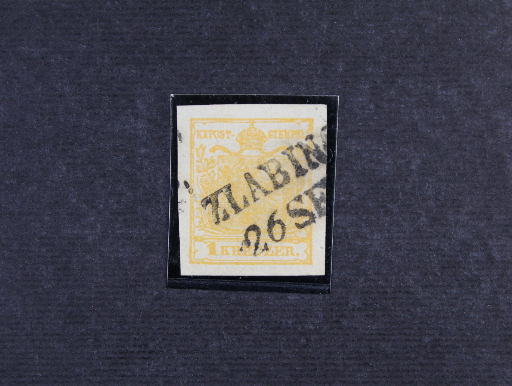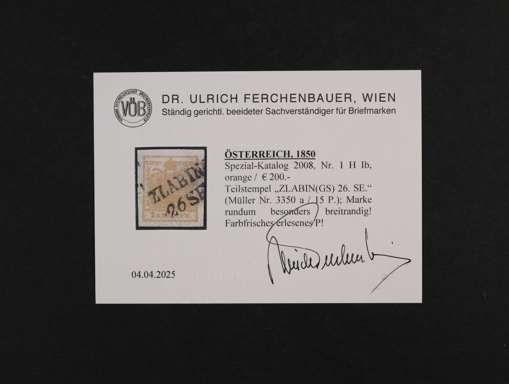 • zn. Fe. č. 1 H, typ Ib v barvě oranžové s téměř kompl. řádk. raz. ZLABINGS 26.SE., zk. a atest Ferchenbauer, lux. střih, 200 EUR