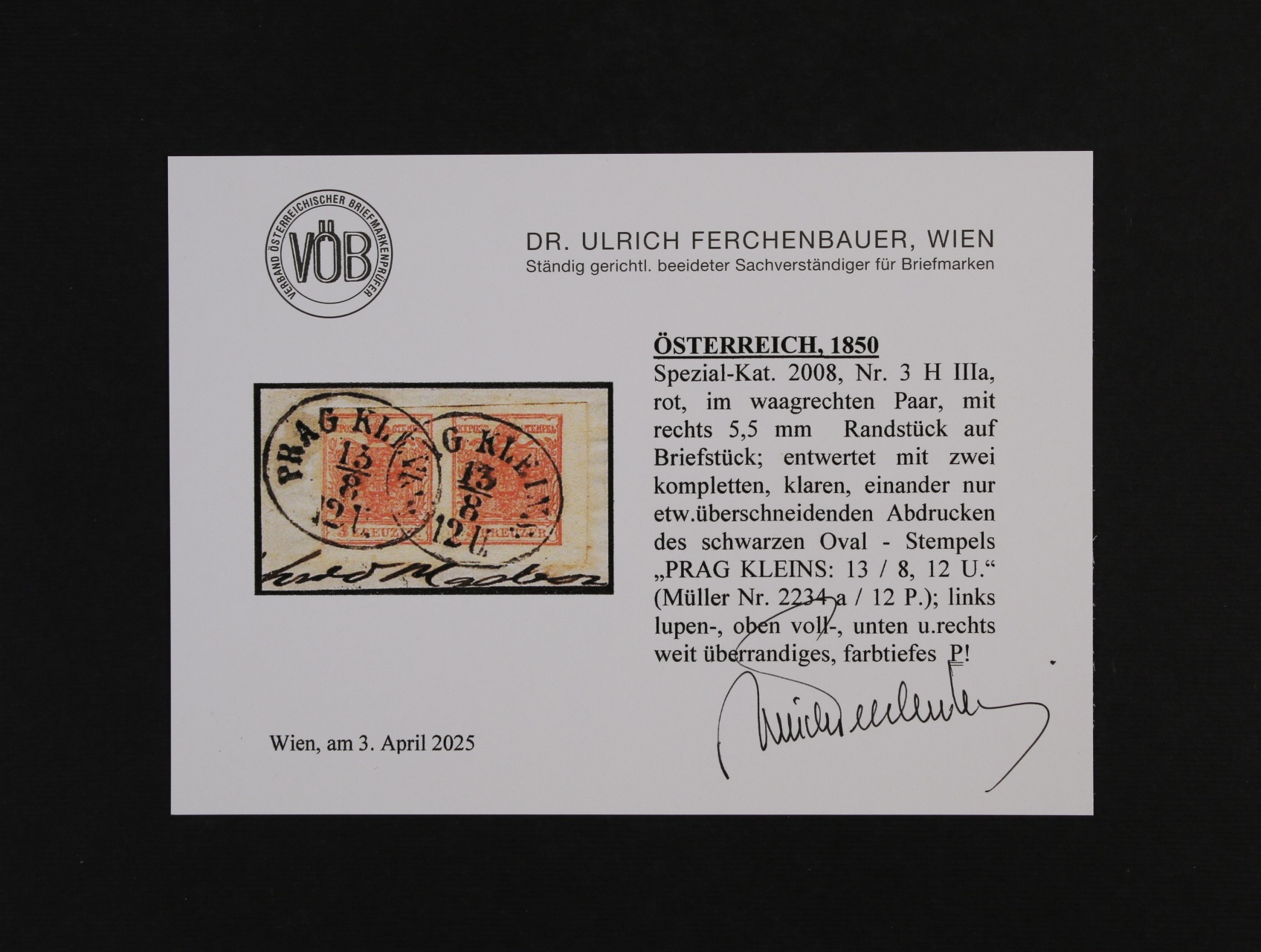 zn. Fe. č. 3 H, typ IIIa červená ve vodorovné dvoupásce s pravým okrajem 5,5 mm na výstřižku se dvěma oválnými raz. PRAG KEINS 13.8., 12 U., zk. a atest Ferchenbauer