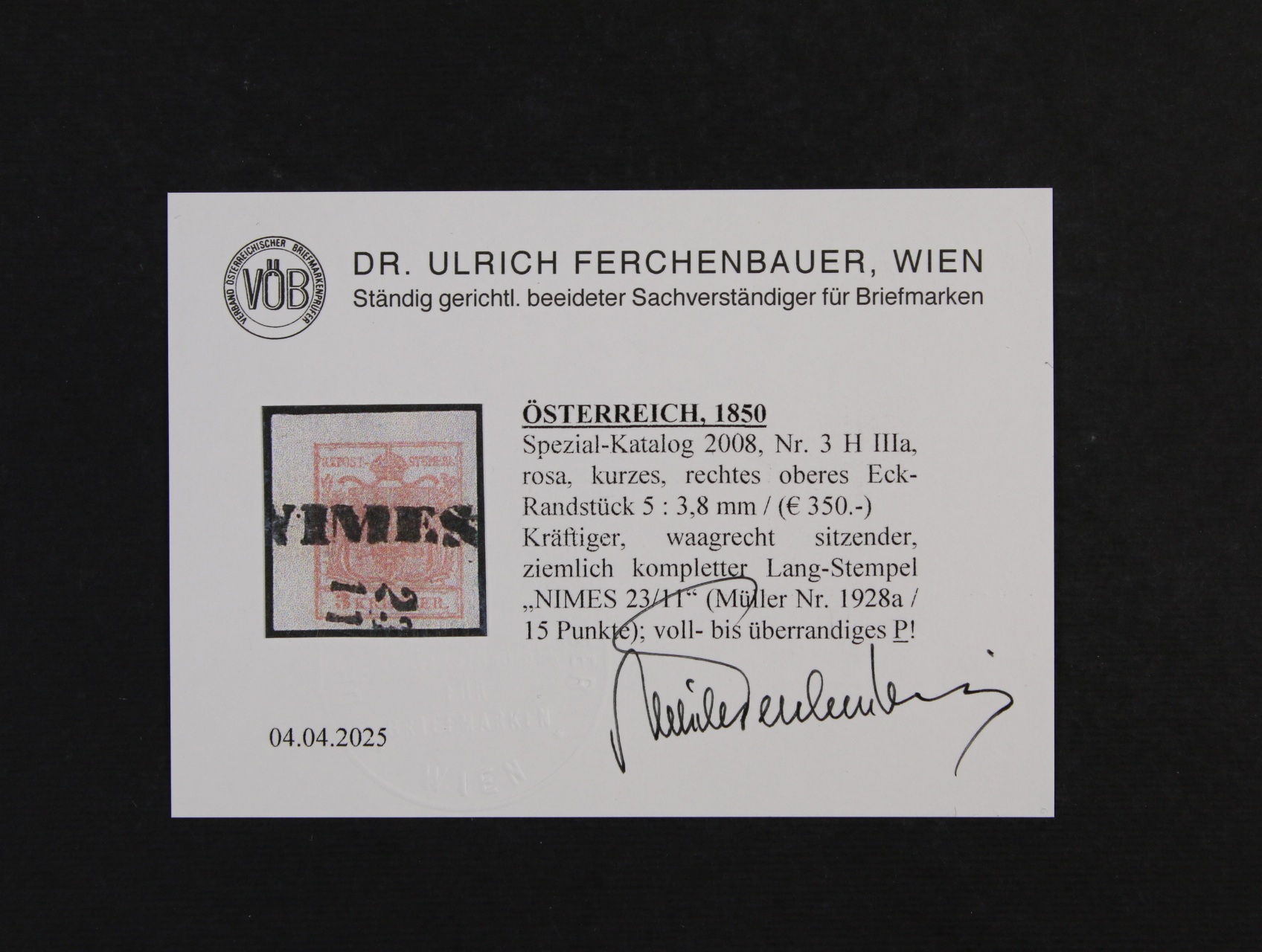 zn. Fe. č. 3 H, typ IIIa, růžová, levý horní kus s okraji 5 : 3,8 mm, téměř kompl. řádk. raz. NIMES 23/11, lux. střih, zk. a atest Ferchenbauer, 350 EUR