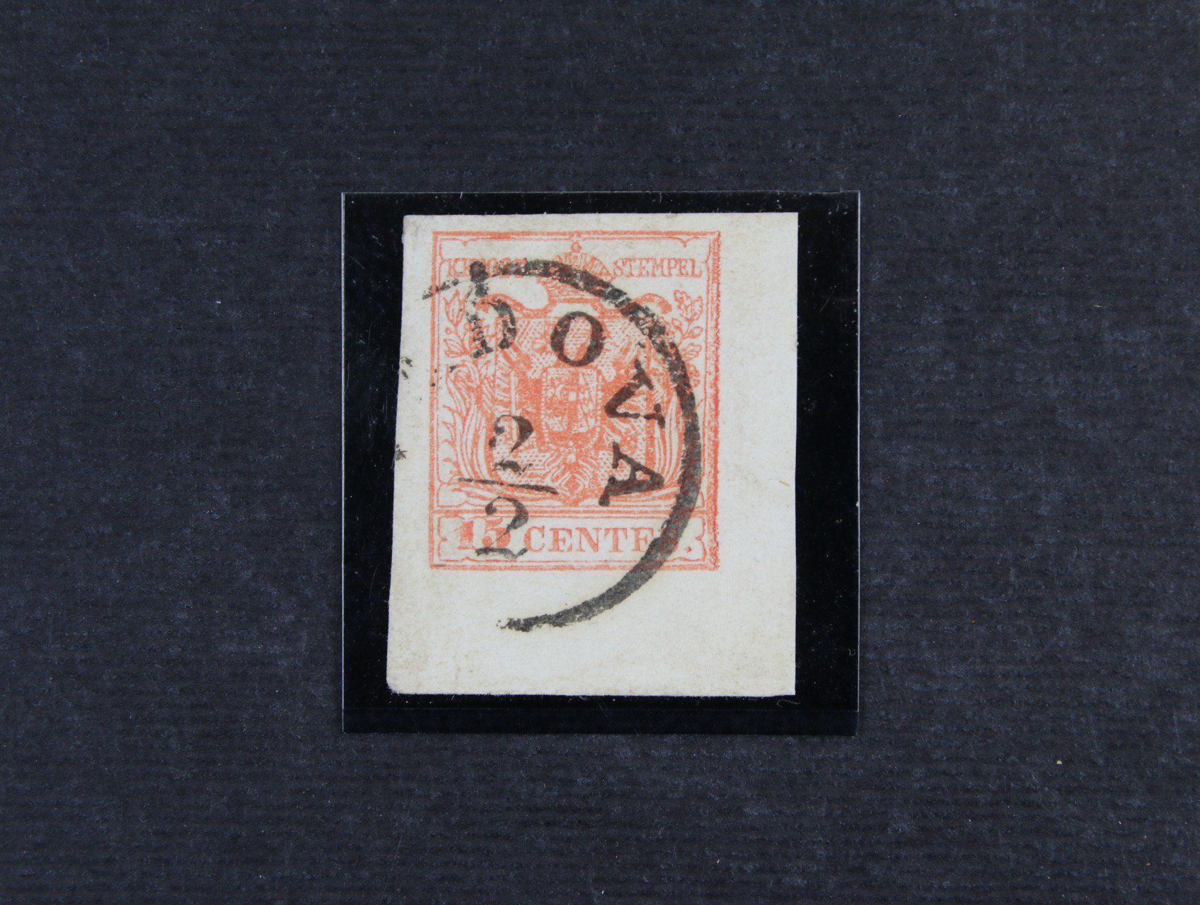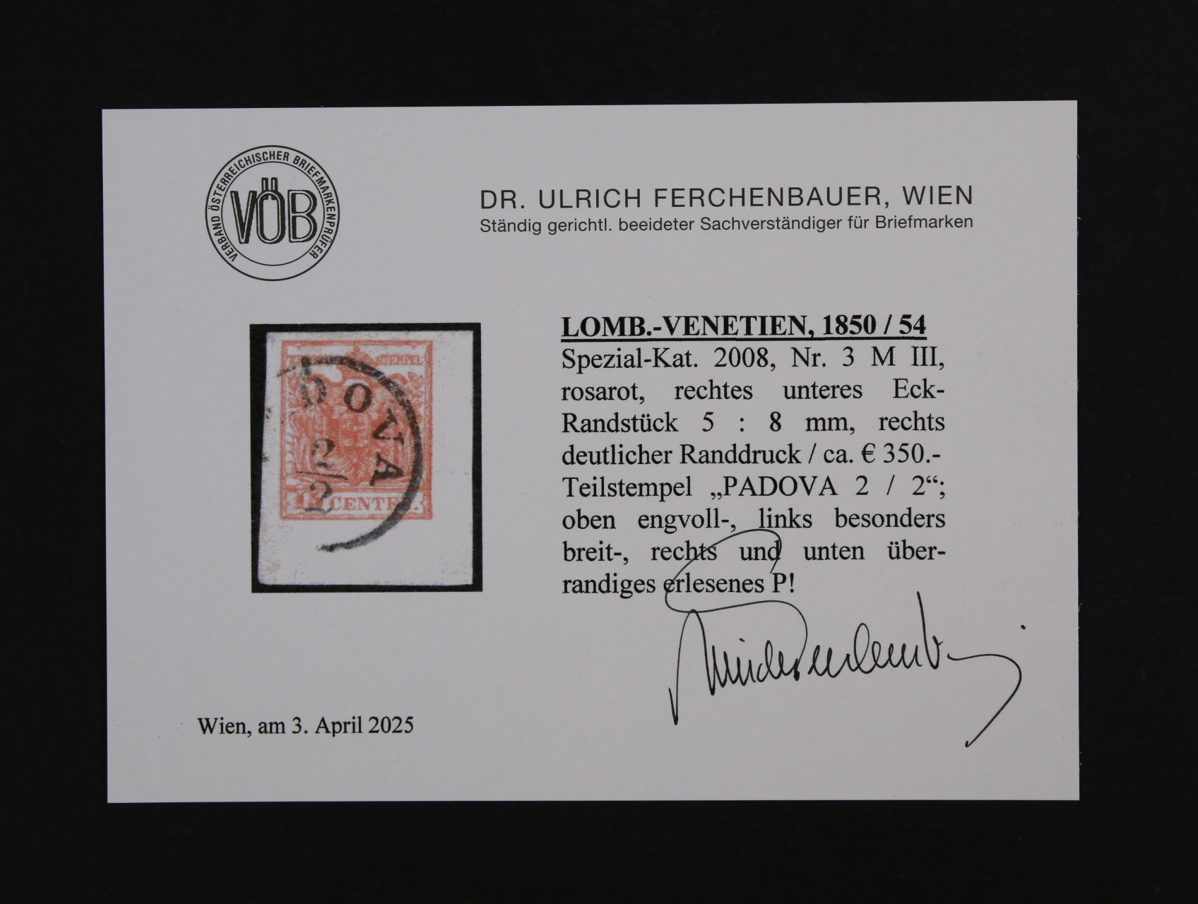 zn. Fe. č. 3 M, typ III, pravý spodní roh. kus s okrajem 5 : 8 mm, růžověčervená, nekompl. jednokruh. raz. PADOVA 2.2., zk. a atest Ferchenbauer, 350 EUR