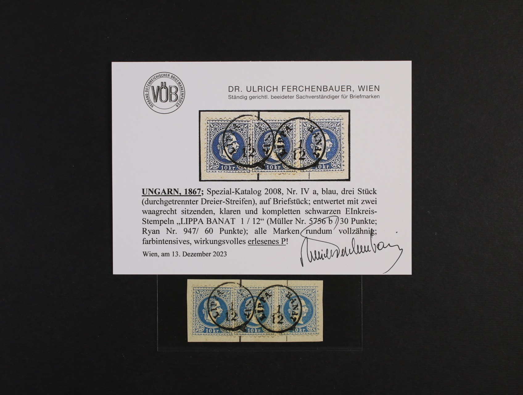 • zn. Fe. č. 38 I ve vodorovné třípásce na výstřižku s kompl. jednokruh. černým raz. BANAT LIPPA 1.12., zk. a atest Ferchenbauer
