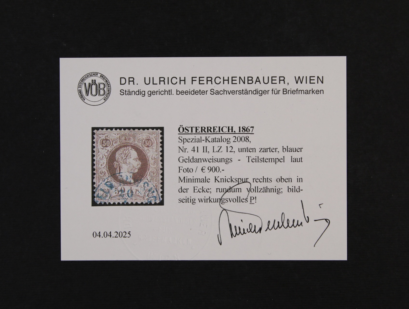 zn. Fe. č. 41 II, ŘZ 12, s částí modrého raz. Geldanweisungs, zk. a atest Ferchenbauer, 900 EUR