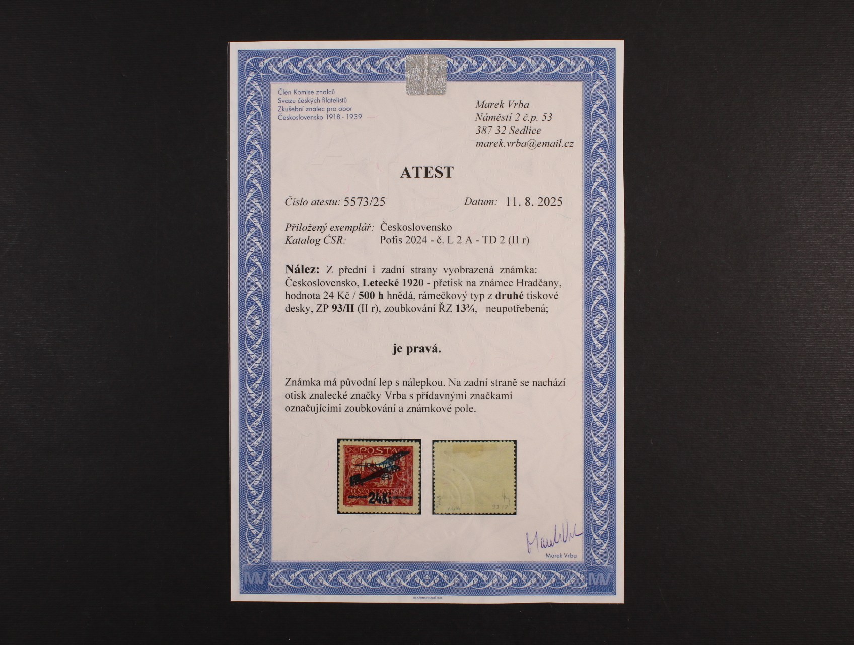 • zn. L č. 2 A, II. rámeč. typ, ZP 93, TD 2, zk. a atest Vrba, kat. cena 22000 Kč