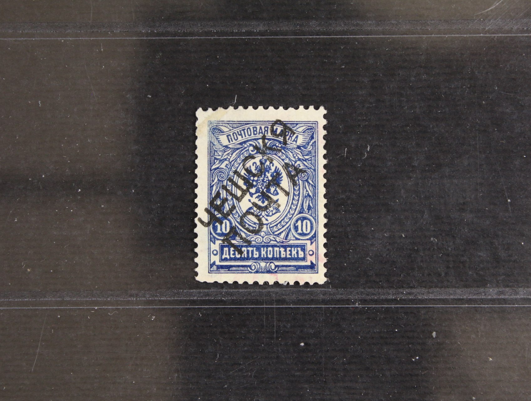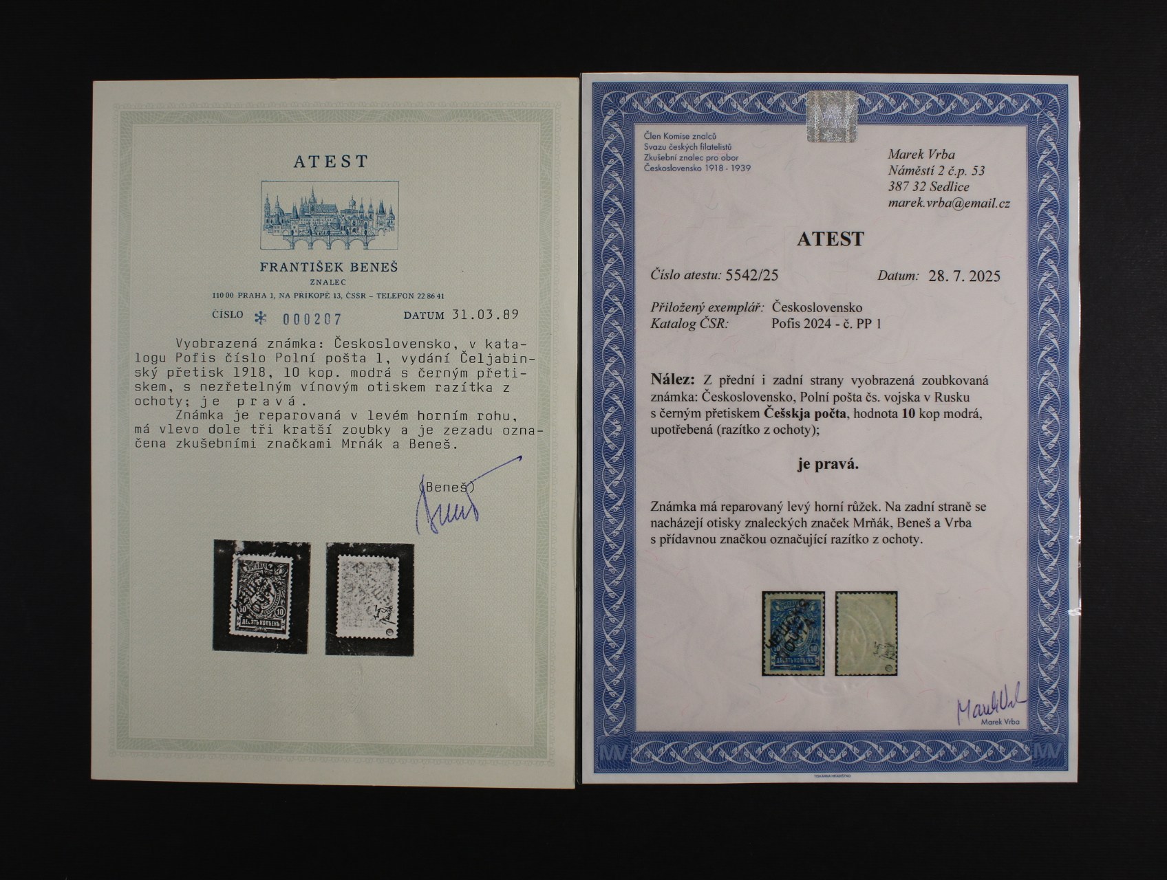 zn. PP č. 1 Polní pošta čs. vojska v Rusku 10kop modrá s černým přetiskem ČEŠSKJA POČTA, nezřetelný červený otisk raz. z ochoty, levý horní růžek reparovaný, zk. Mrňák, Beneš, Vrba, atest Beneš, Vrba, zajímavé, vzácné
