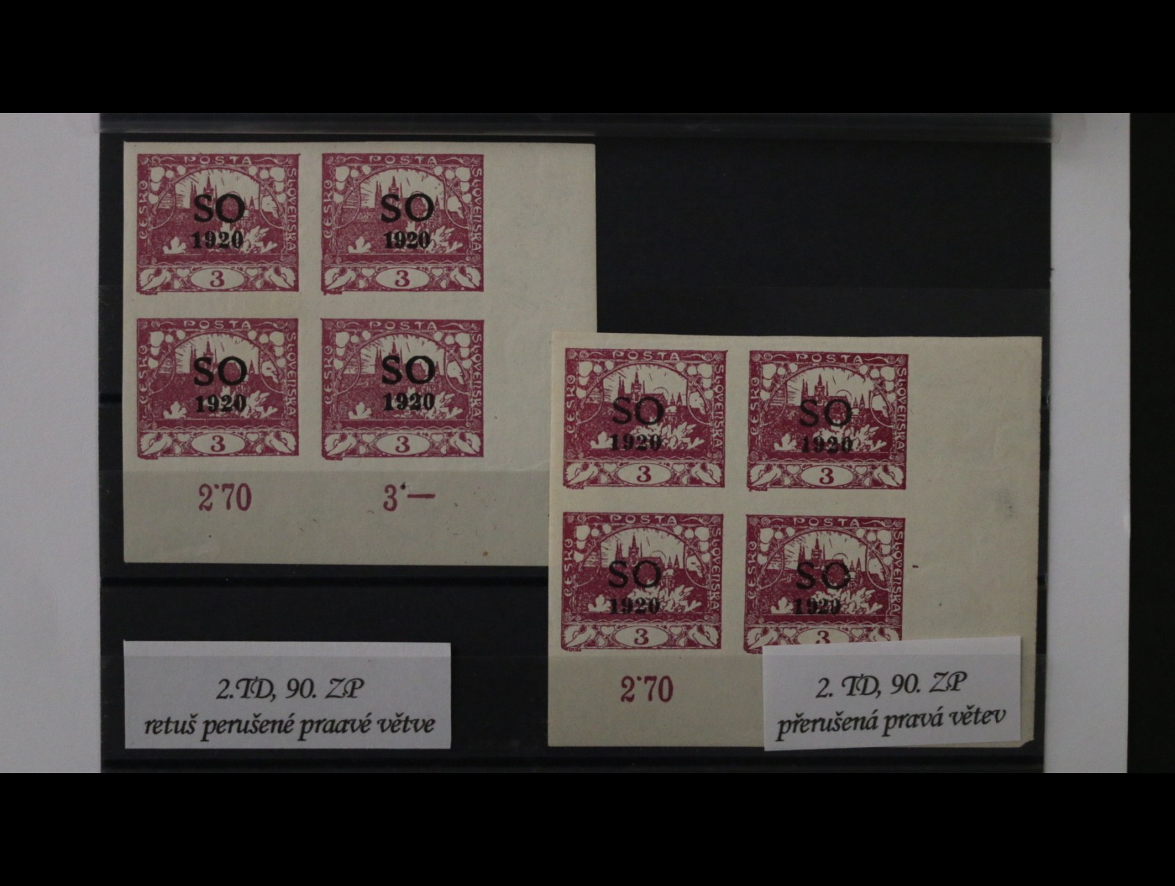• zn. SO č. 2 - pravý spodní roh. čtyřblok s DV vylomená větev, dtto s retuší této vady