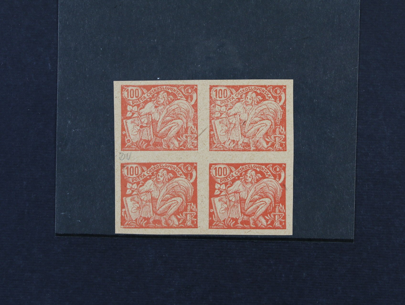 • ZT zn. č. 173 v orig. barvě ve čtyřbloku na nažloutlém papíře s VV velká červená skvrna na spodním rohu knihy a lipových ratolestech na levé horní zn.