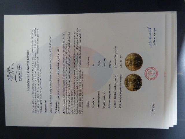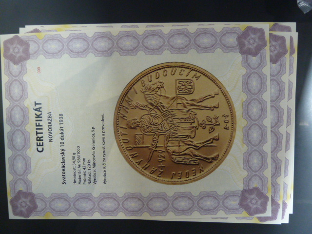 1, 2, 5, 10 Dukát 1938 sv. Václav, novoražba 2022, náklad 120 kusů, číslo 111, certifikáty, společná etue