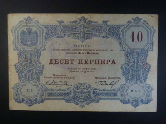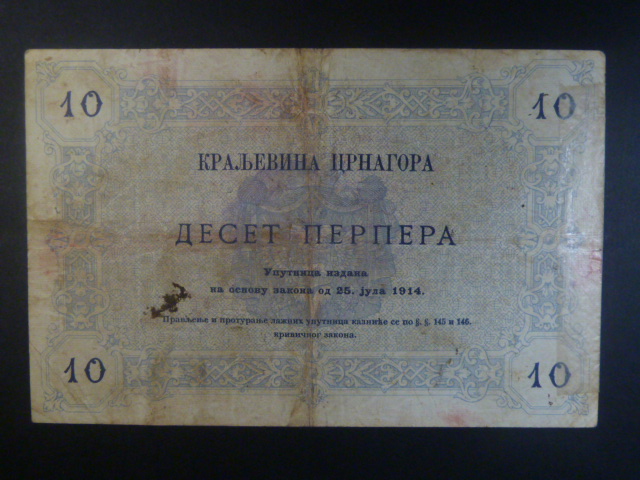10 Perpera 1914 Montenegro, vojenské vydání, razítko CETINJE, Ri. M30