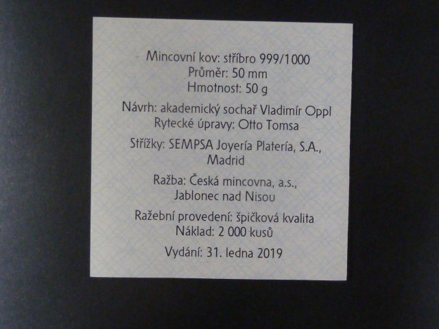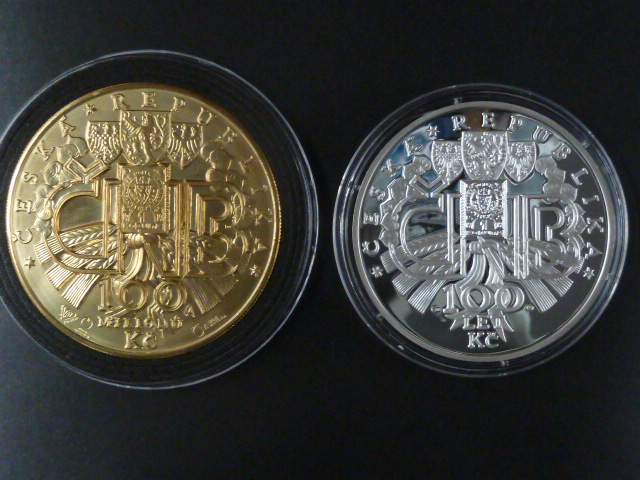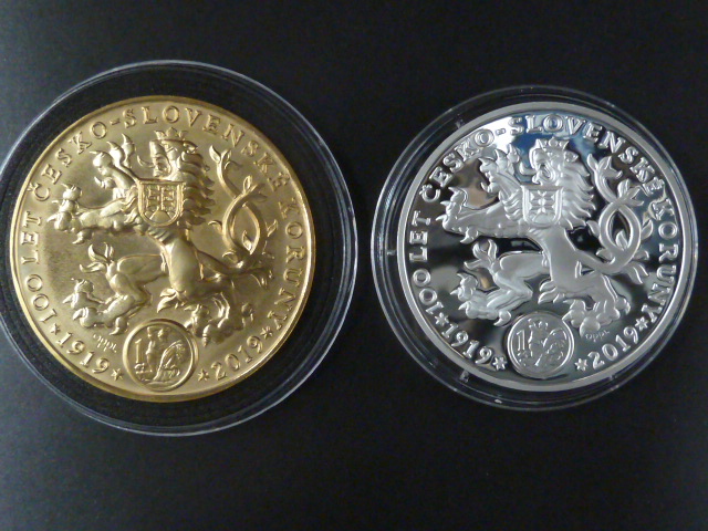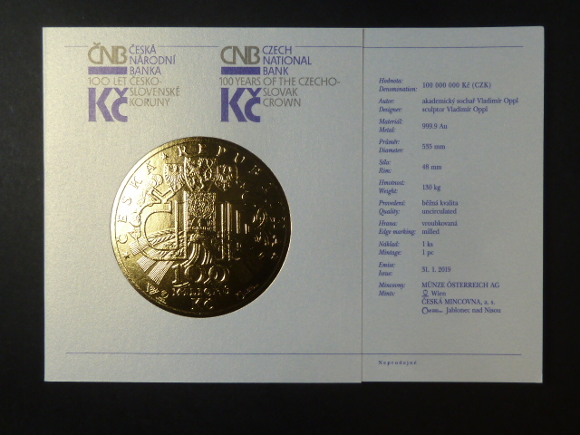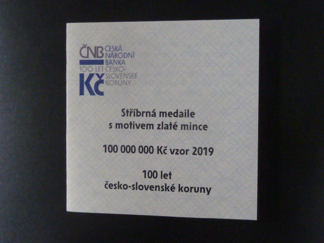 100.000.000 Kč 2019 100.let česko-slovenské koruny, mosazný autorský odražek, včetně certifikátu, průměr 53 mm + Ag medaile ČNB "100 LET KČ" 1919 - 2019, Ag 0,999, 50 g