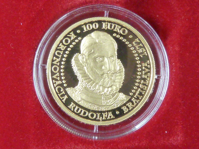 100 Euro 2022 450.výročí Bratislavské korunovace Rudolfa, Au 900, 9,5g, etue, certifikát