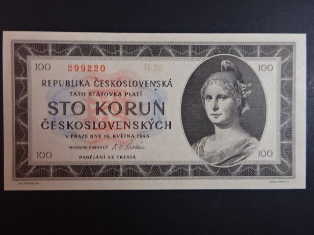 100 Kčs 1945 série B 26, perf. "3md" nad sebou