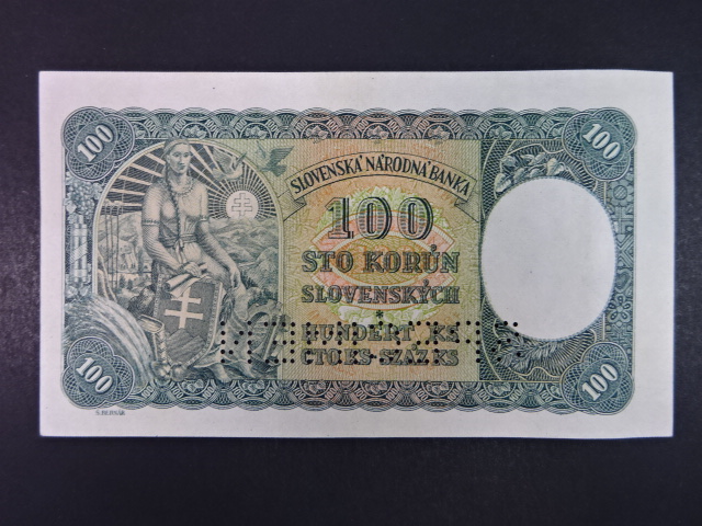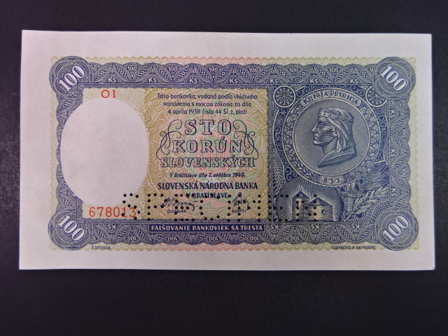 100 Ks 1940 I.vydání, série O 1, 1x perf. SPECIMEN dole