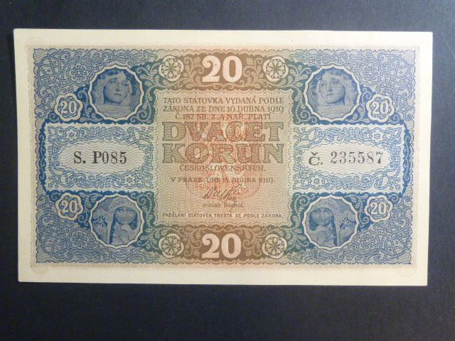 20 Kč 1919 série P 085, nepatrně ohlý rožek jinak N