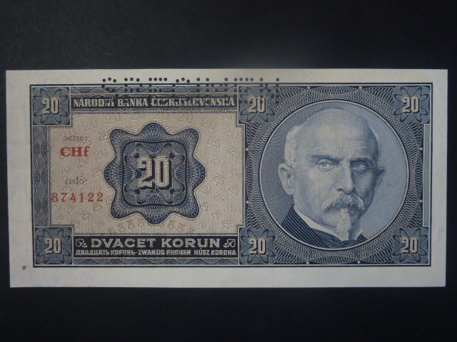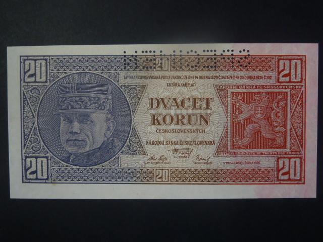 20 Kč 1926 série Chf, perf. SPECIMEN z rubu