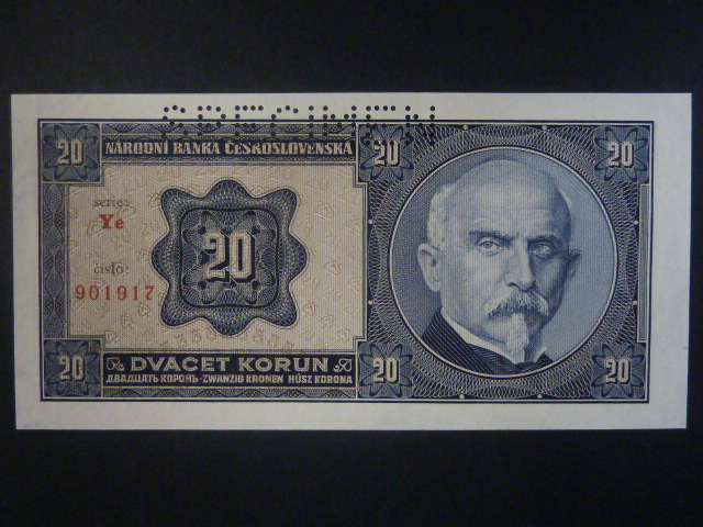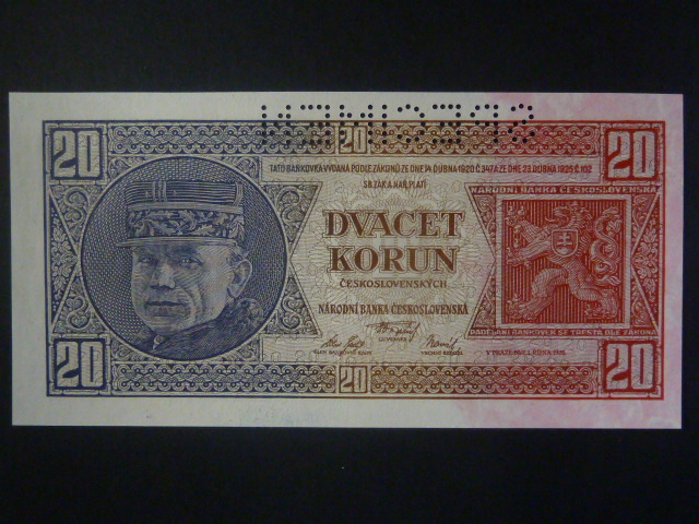 20 Kč 1926 série Ye, perf. SPECIMEN z rubu