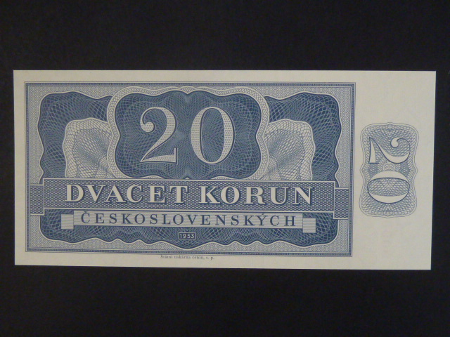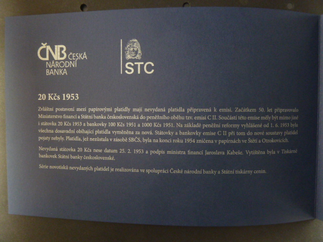 20 Kčs 25.2.1953 série A 01 000000 novotisk vydaný STC ve spolupráci s ČNB, papír s vodoznakem, kvalitní tisk, dárkový obal