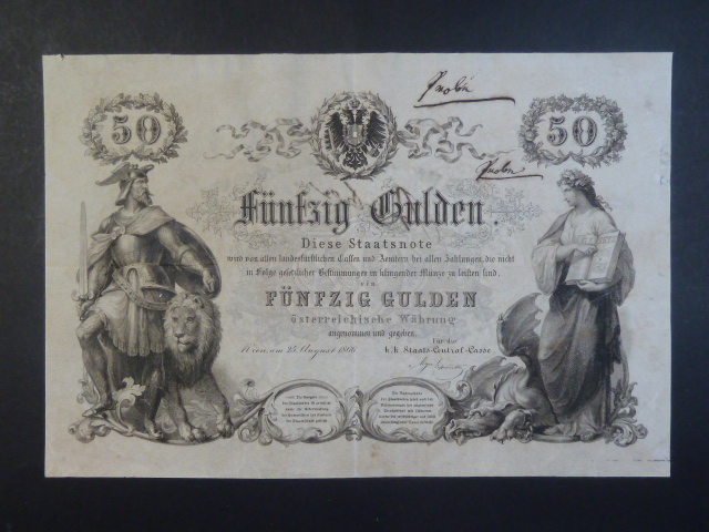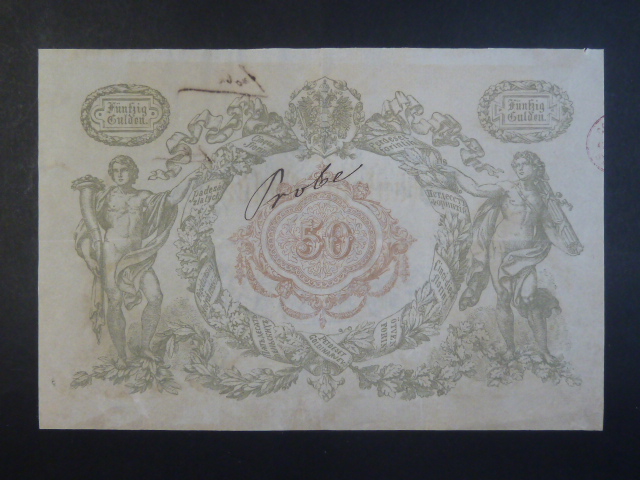 50 Gulden 1866 bez čísla a série, hlavní tisk šedou barvou, ručním nápisem "Probe" na lícní (2×) i rubové straně