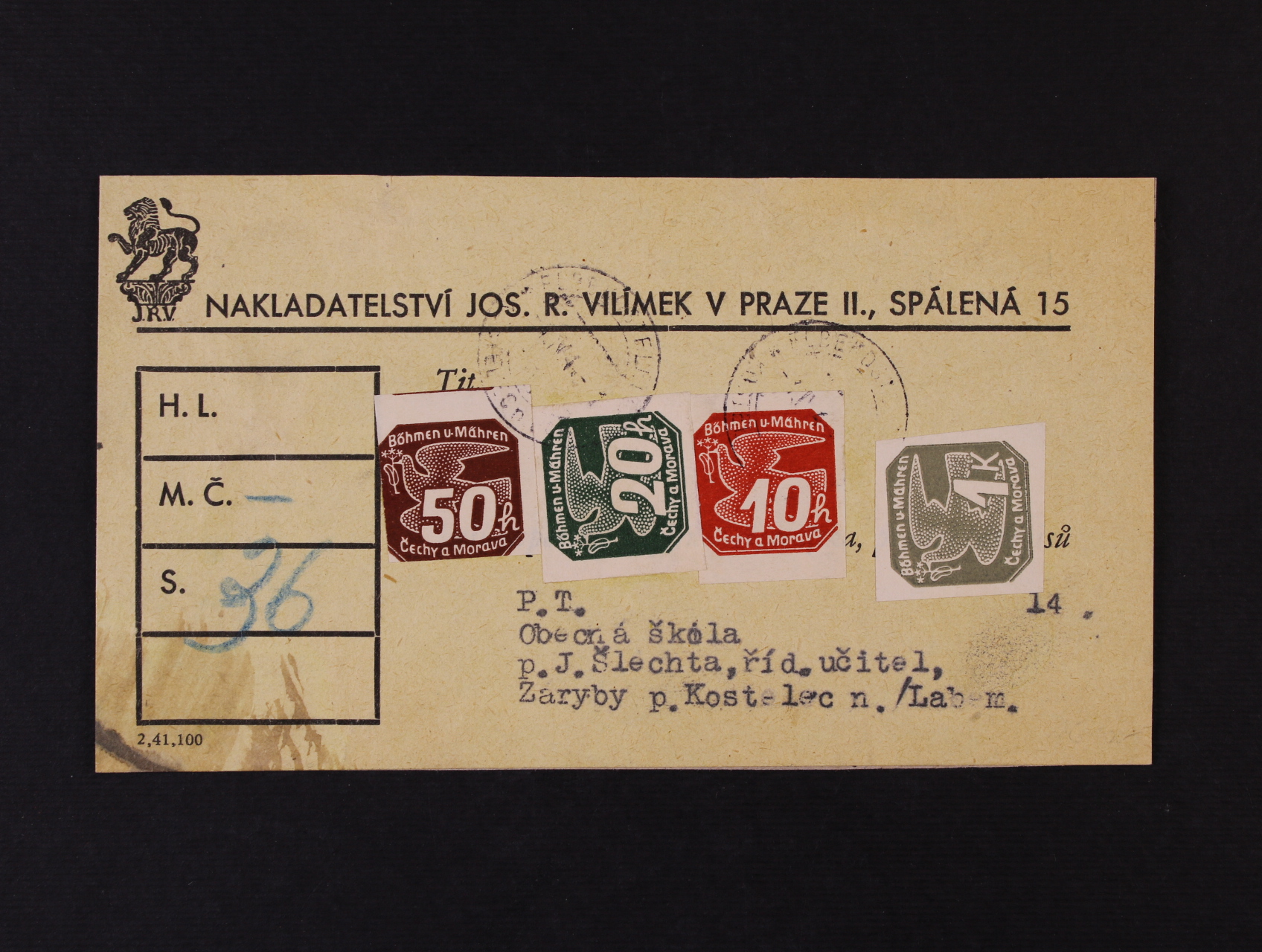 adresní lístek nakladatelství Jos. R. Vilímek v Praze zaslaný na zásilce novin do Kostelce nad Labem, frank. pestrou vysokou frankaturou zn. NV č. 5, NV 7 - NV 9, DR KOSTELEC NAD LABEM 3.4.41