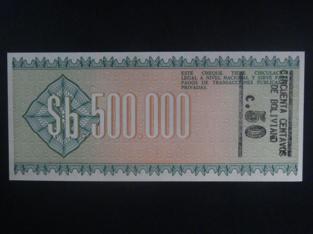 BOLÍVIE, 50 centavos/500000 pesos Bolivianos 1987, BNB. B384a, Pi. 198