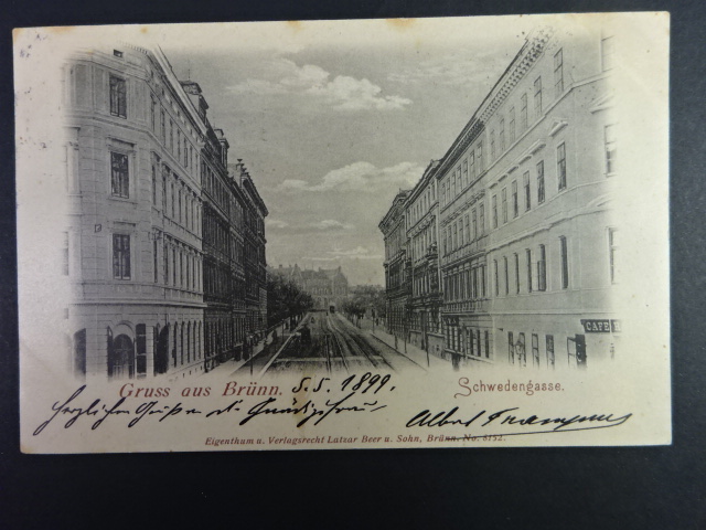 Brno - Hradební ulice (Basteigasse) dnes Roosveltova - koláž s tramvají, prošlá 1900