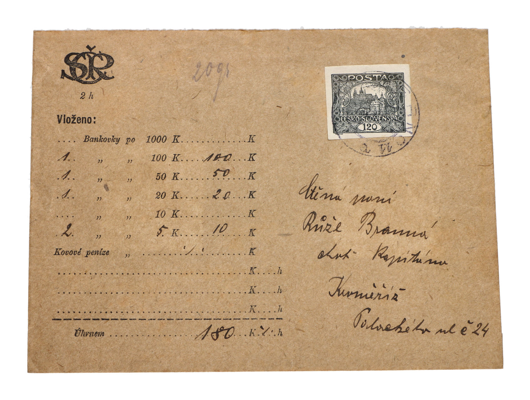 cenné psaní o váze 20g na 180 K frank. zn. č. 21, pod. raz. BRNO, III. tarif. období, na zadní str. vystřižené pečetě