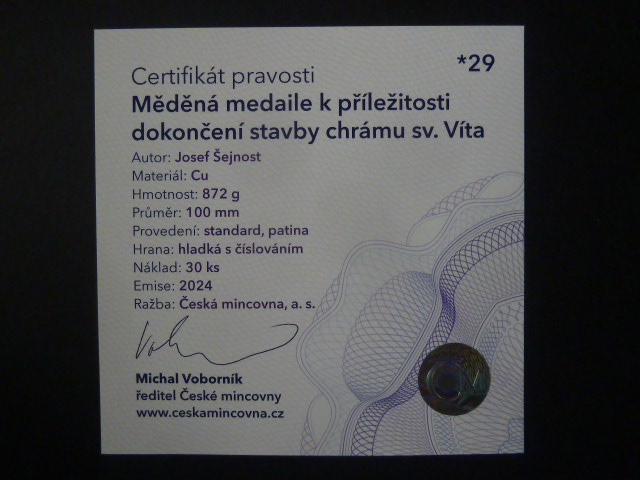 Cu medaile 2024 Dokončení stavby chrámu sv. Víta 2024, hmotnost 872 g, náklad číslovaných 30 ks náklad, číslo "29", ražba Čm