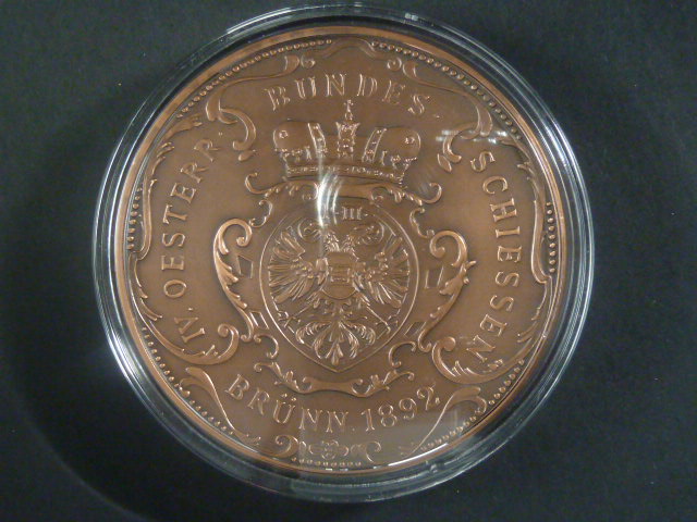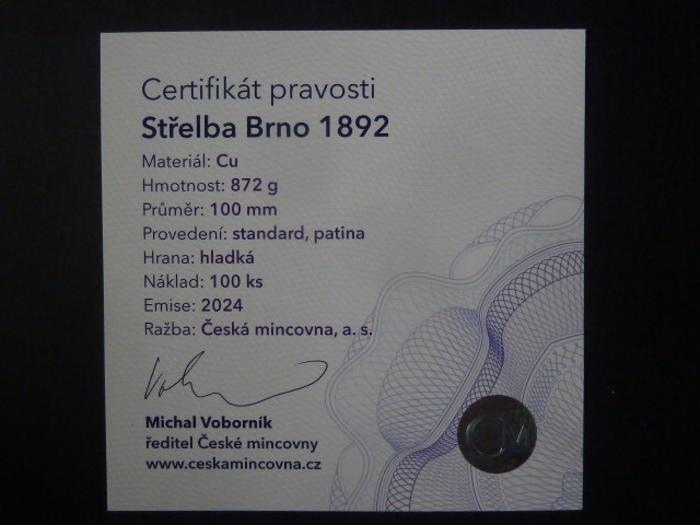 Cu medaile 2024 Střelba Brno 1892, hmotnost 872 g, náklad 100 ks, ražba Česká mincovna
