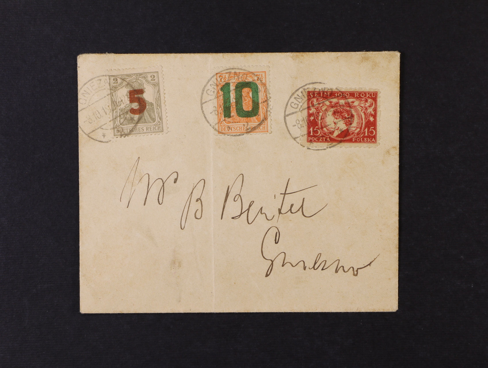 dopis v Místě frank. zn. Mi. č. 124, 135 - 6, pod. raz. GNIEZNO 8.10.19, kat. cena zn. 360 EUR