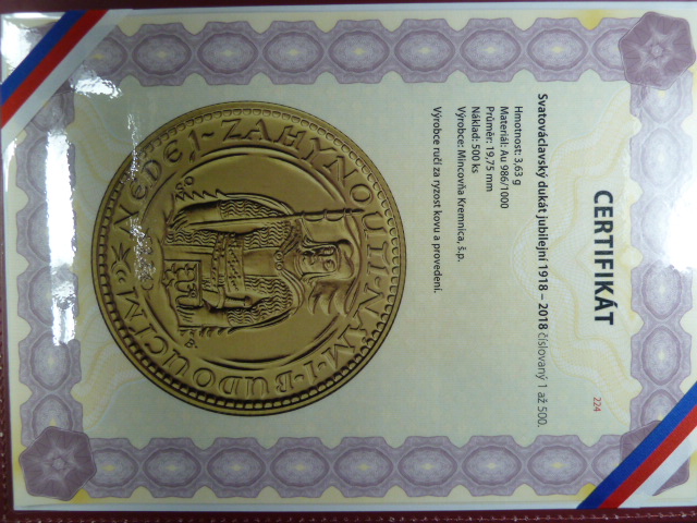 • Dukát 1918 - 2018 sv. Václav, jubilejní, číslovaný č. 500 kusů, č. 161, certifikát, etue, ražba Kremnice