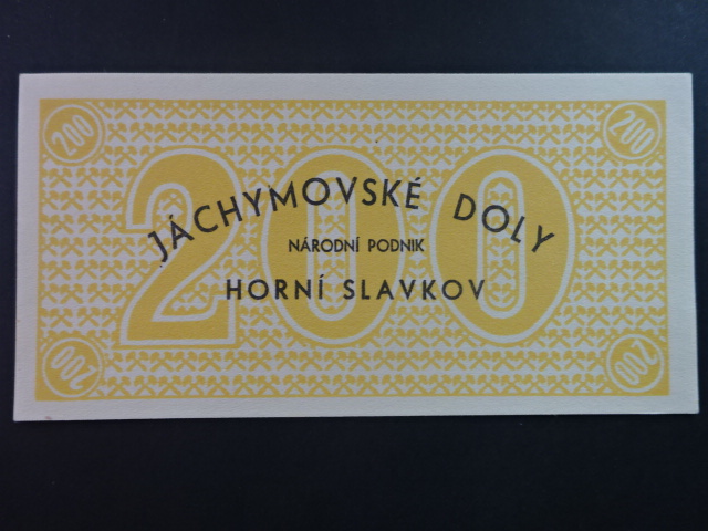 Jáchymovské doly n.p. Horní Slavkov, poukázka 200 K b.d. v žluté barvě