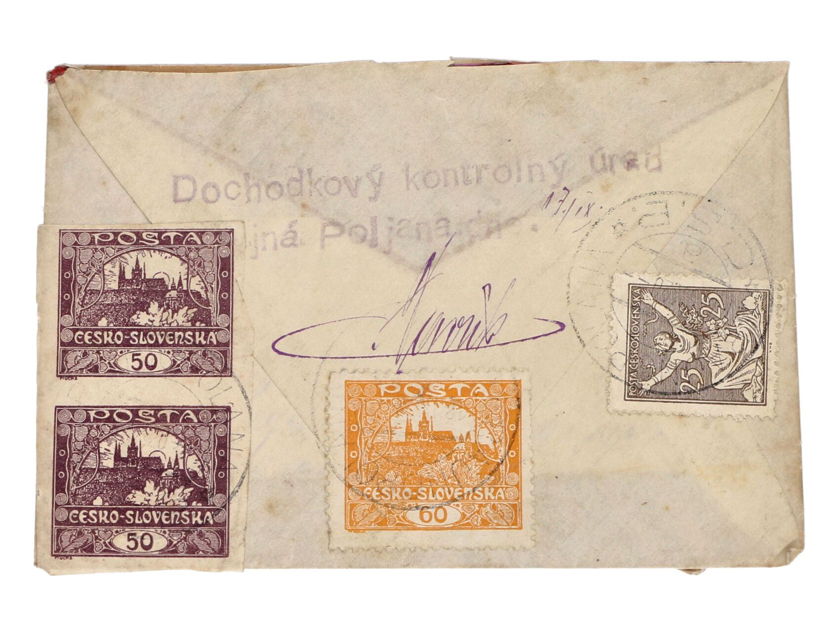 R-dopis do Brna frank. zn. č. 15 ve svislé dvoupásce, 17 B, 152, pod. raz. NIŽNI KOMÁRNIK 18.9.19 + řádkové ruční raz. Dochodkový kontrolný úrad Nižná Poljana, zajímavé