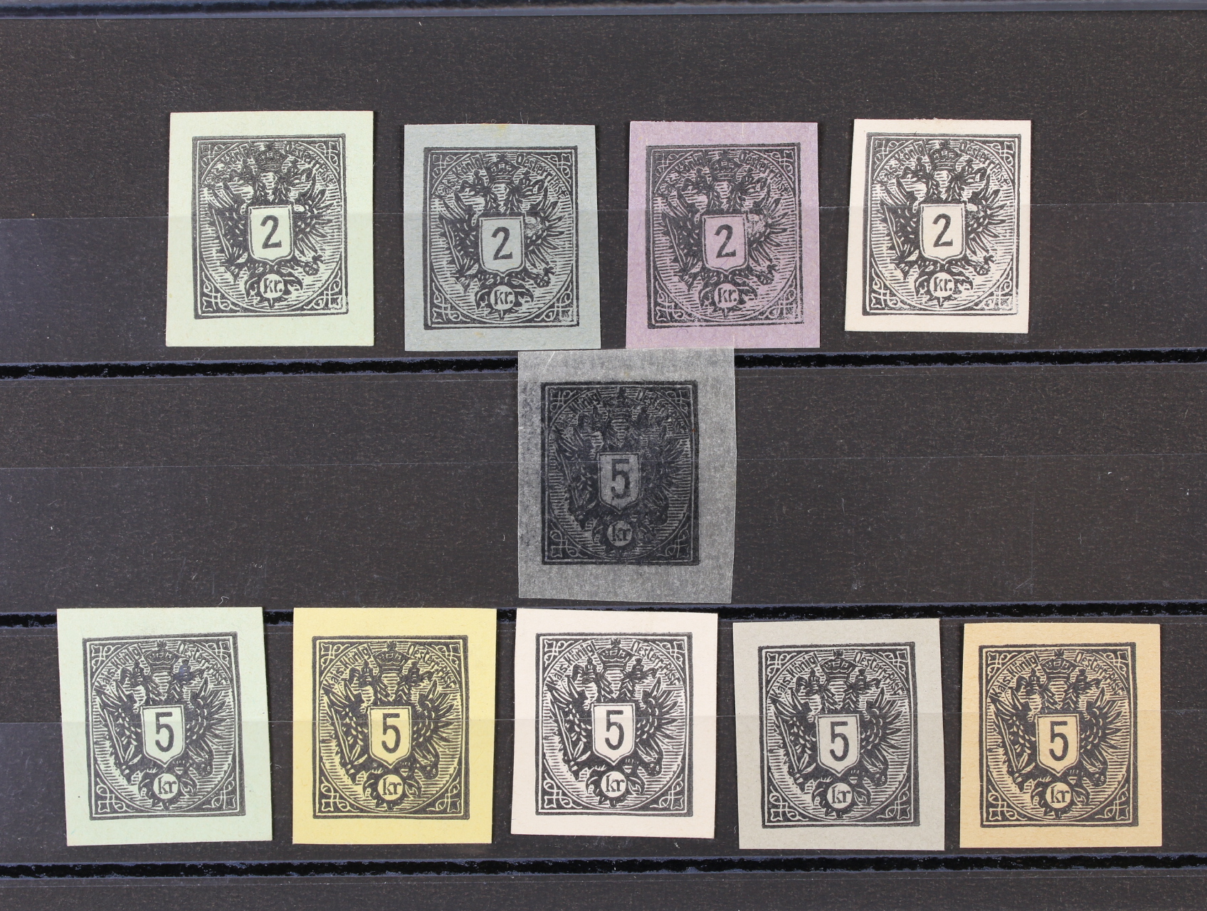 sestava 10 ks nátisků "Andrucke" ZT zn. 2kr a 5kr dvouhlavá orlice z r. 1883 na různých papírech v černé barvě