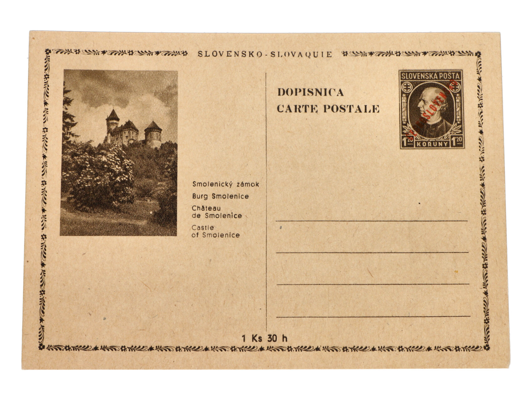 slovenská celina CDV č. 4/18a chybotisk strom vlevo s příčným červeným přítiskem ČESKOSLOVESNSKO, nepoužitá, dobrá kvalita
