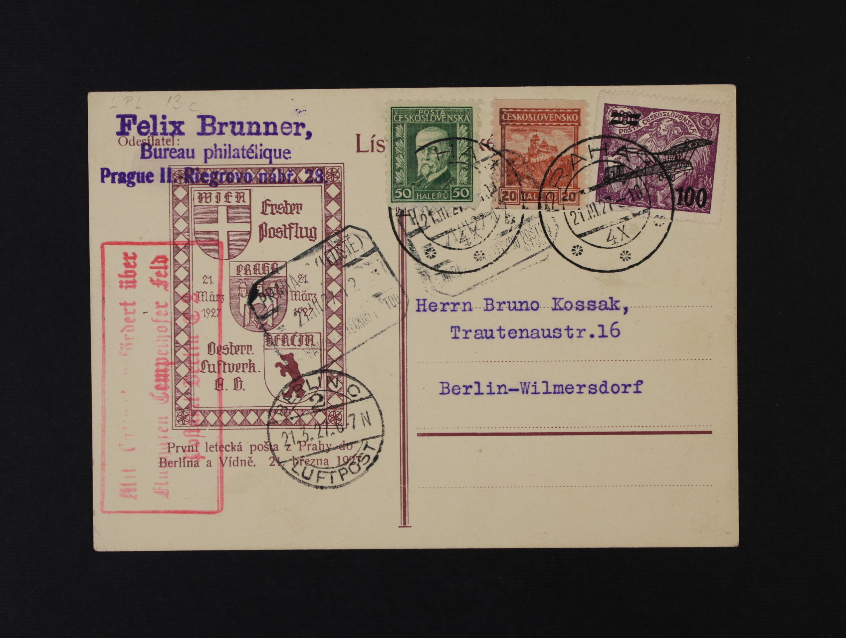 spec. KL s přítiskem 1. let 21.března 1927, frank. mj. zn. L č. 5, pod. raz. PRAHA 1 21.3.27, přídavné rámeč. raz. PRAHA LETIŠTĚ ..., červený rámeč. let. kašet a přích. raz. BERLIN C 21.3.27, zajímavé