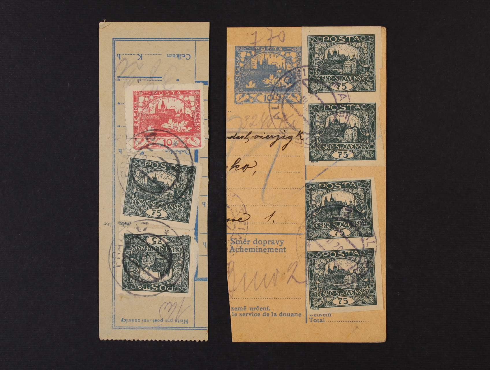 ústřižek pošt. průvodky frank. zn. č. 18 - na přední str. 2x dvoupáska, na zadní str. svislá čtyřpáska + zn. č. 5, pod. raz. ALEXOVICE a ústřižek pošt. průvodky frank. zn. č. 18, typ I + 18, typ II +