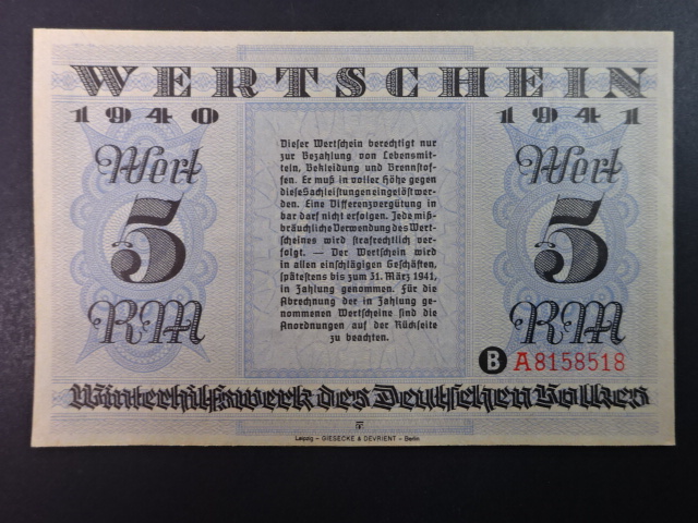 Winterhilfswerk 1934-1944 (Zimní pomoc), 5 RM 1940/1941 série A, Ro. 717, Grab. WHW-18