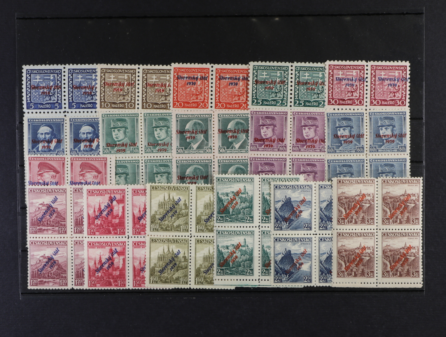 zn. č. 2 - 18 ve čtyřblocích, převážně zkoušeno Slov. filatelista, Kozák, dobrá kvalita, kat. cena cca 200 EUR