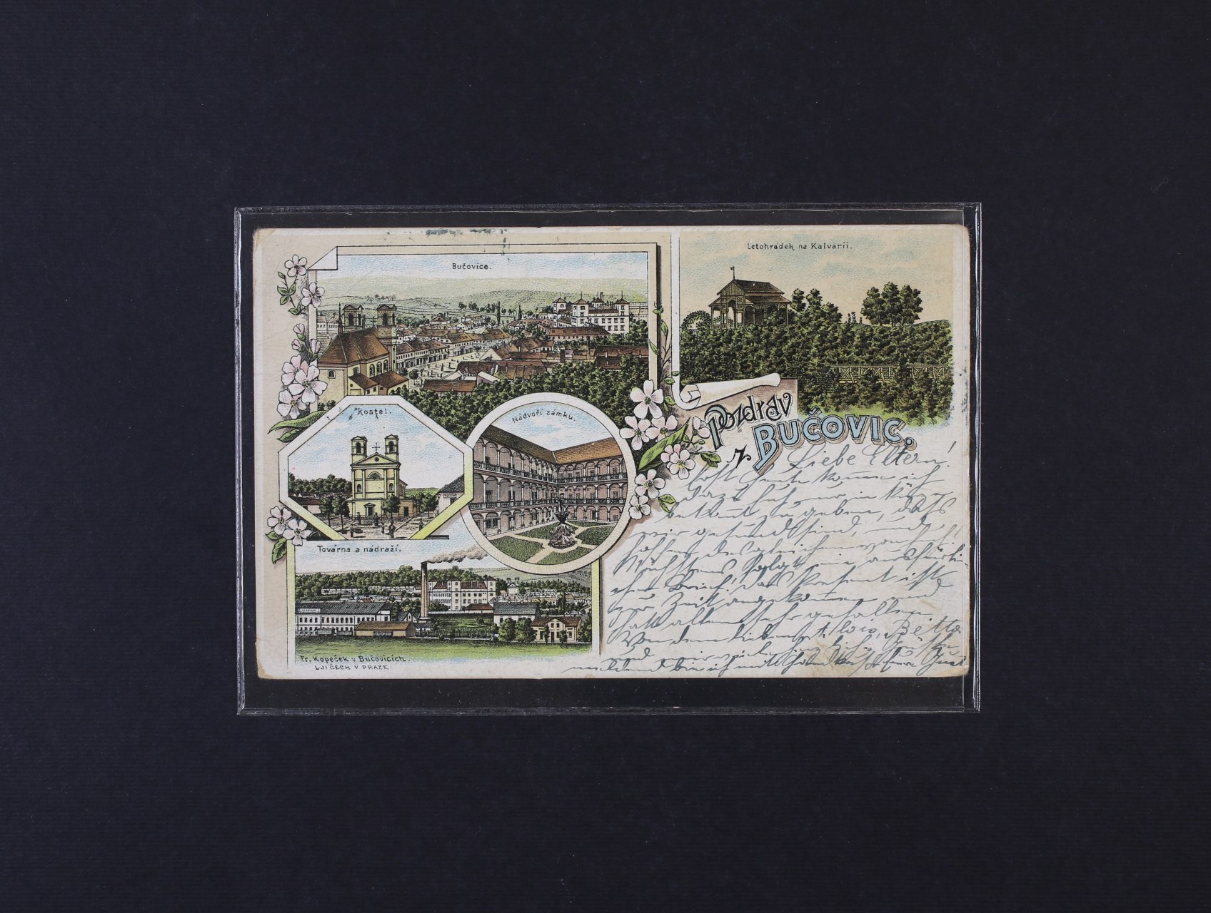 Bučovice, okres Vyškov - bar. litograf. koláž, použitá 1898, na zadní str. stržená zn.