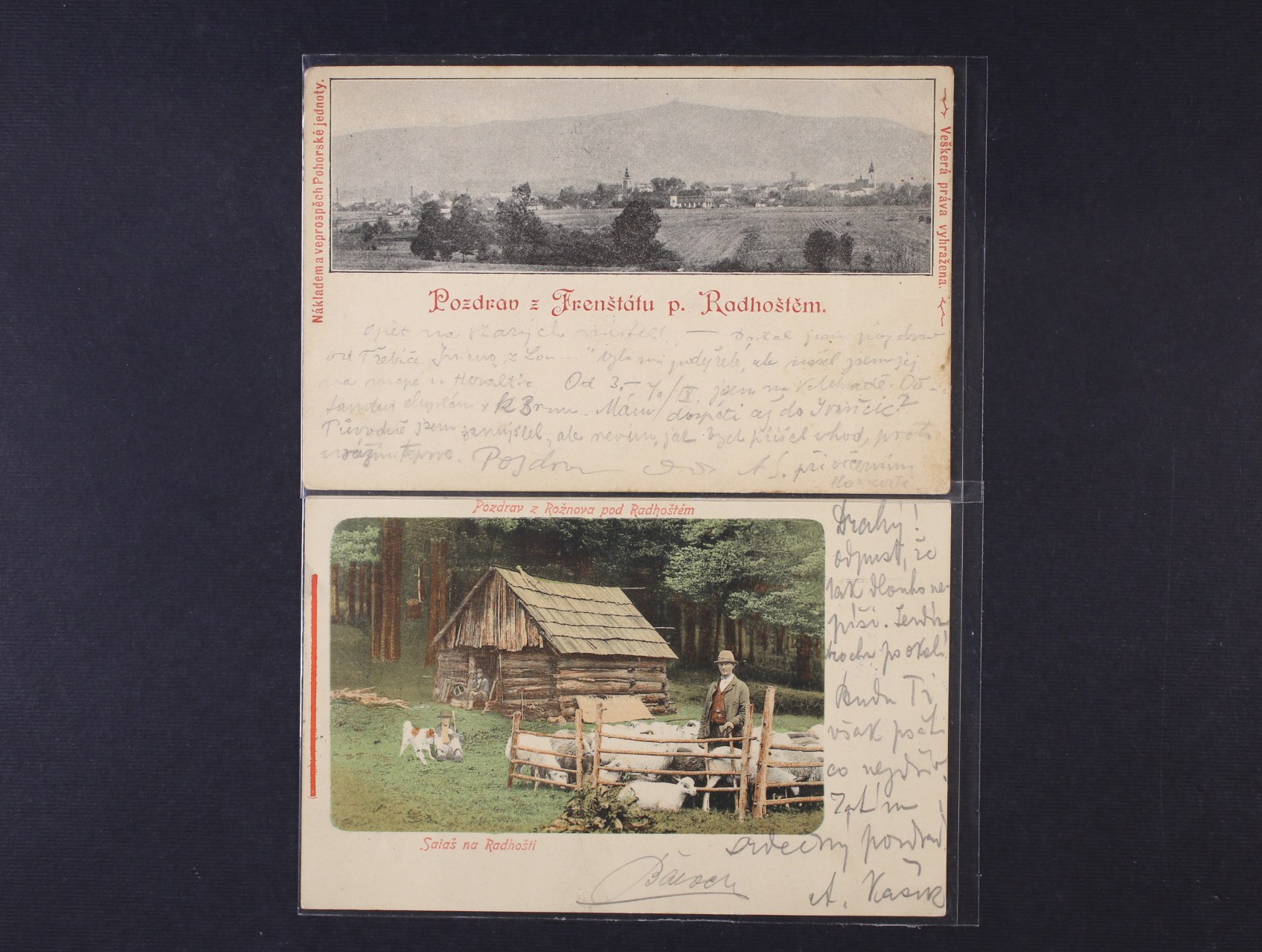 Frenštát pod Radhoštěm, okr. Nový Jičín - jednobar. a barevná pohlednice, použité 1898 a 1901
