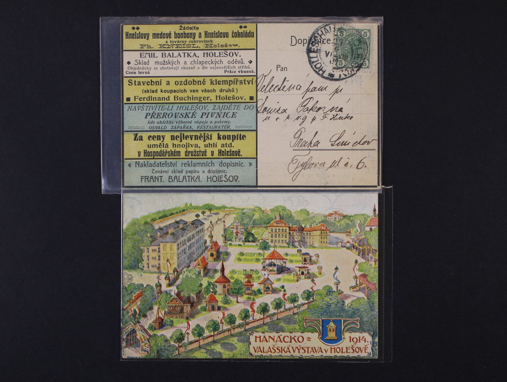 Holešov, okr. Zlín - bar. pohlednice Valašská výstava v Holešově 1914 nepoužitá a reklamní bar. pohlednice holešovských obchodníků, použitá 1907, zajímavé