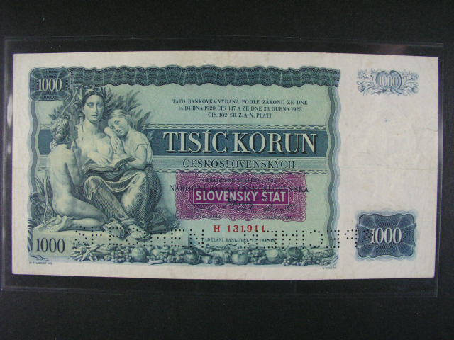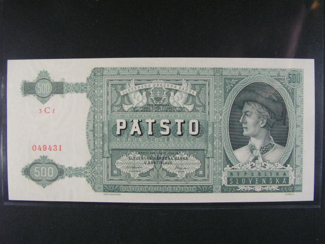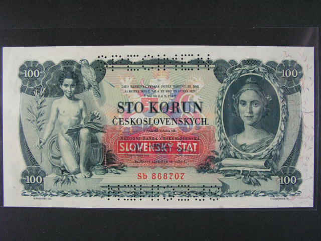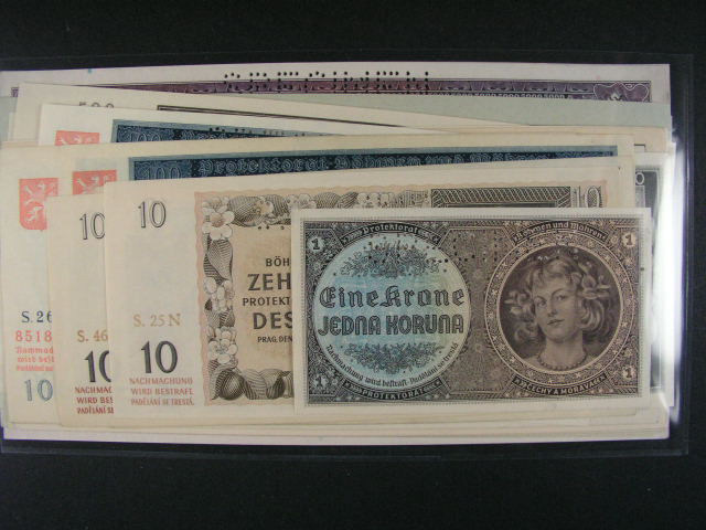 1 K, 10 K (2x), 20 K, 50 K I. (3x), 50 K II. (2x), 100 K I. i II.vydani (4x), 500 K I. i II.vydani (10x), 1000 K II.vyd. (3x), 5000 K 1944 (5x), 5000 K nevydana (2x), vse s perf. SPECIMEN, celkem 33ks