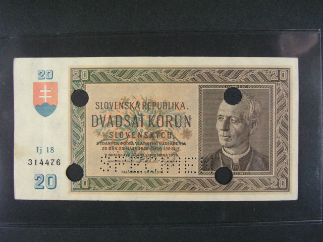 20 Ks 15.9.1939 serie Ij18, 1x perf. SPECIMEN + 4x perf. otvor, Ba, 47b, Pi. 5s