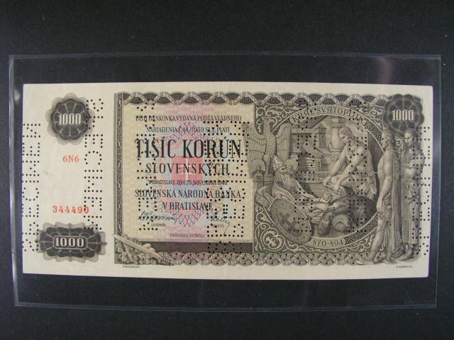 sestava perforovanych bankovek SPECIMEN, 1 K (D), 10 K (N), 20 K (A), 100 K (B), 100 K II. (A), 50K 1940, 50 K 1944, 500 K (J, CHa), 1000 K (Ga), 5000 K 1940, 5000 K 1944, (celkem 13ks)