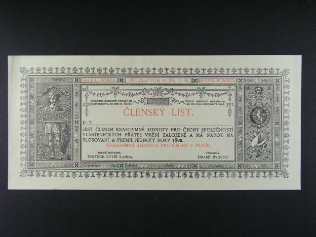 Clensky list (1/2 Guinea - 5 zl. 25kr - 12 Francs) Krasoumna jednota pro cechy v Praze, vypsany, zajimavy, dekorativni
