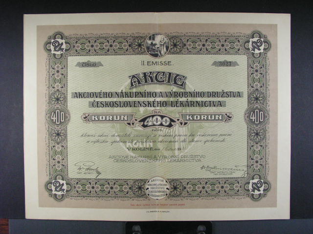 Akcie na 400 K 1.1.1921 Akcioveho nakupniho a vyrobniho druzstva cs. lekarnictva, dekorativni