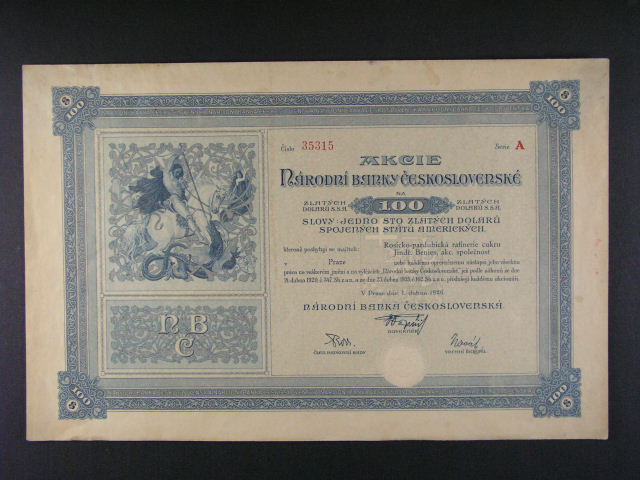 Akcie Narodni Banky Ceskoslovenske na 100 Zlatych dolaru S.S.A. 1.4.1926, vypsana, velmi dekorativni, v modre barve